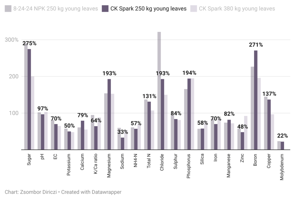 The young leaves of CarbonKick Spark 250 kg/ha dosage show higher values than the NPK 8-24-24 treatment. We can easily spot the long-lasting effect of CarbonKick in macro- and micronutrients as well.